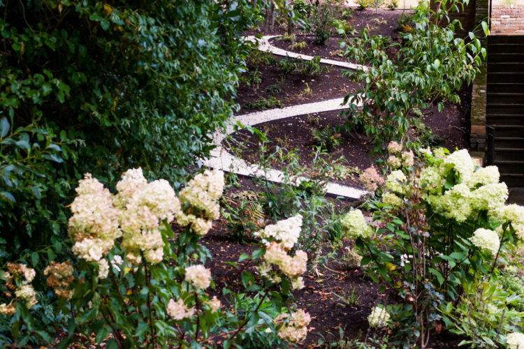 The side of the garden was a very steep bank only accessible via narrow steps, and a sinuous path was added to allow for greater accessibility as well as creating a delightful walk-through planting.